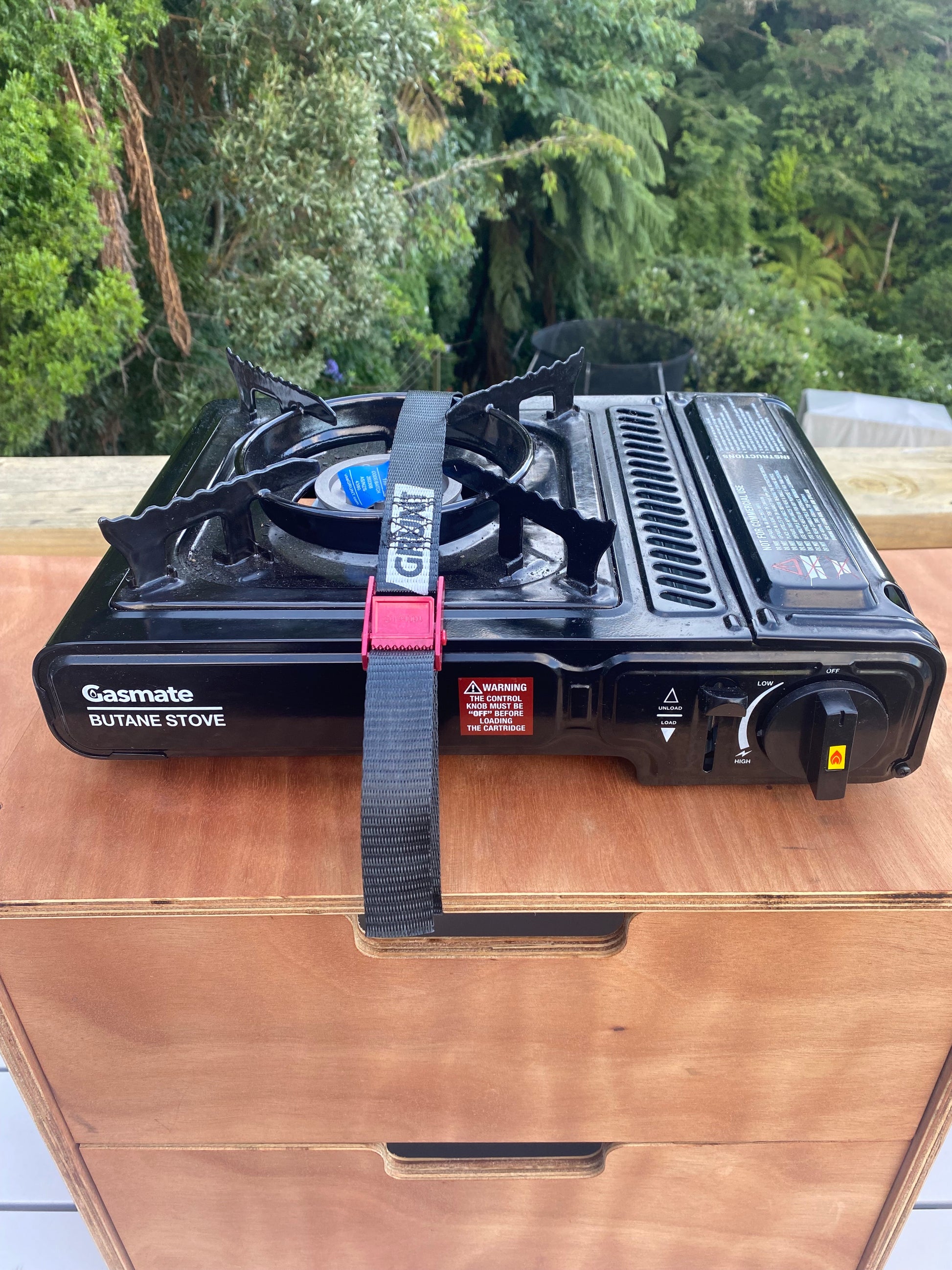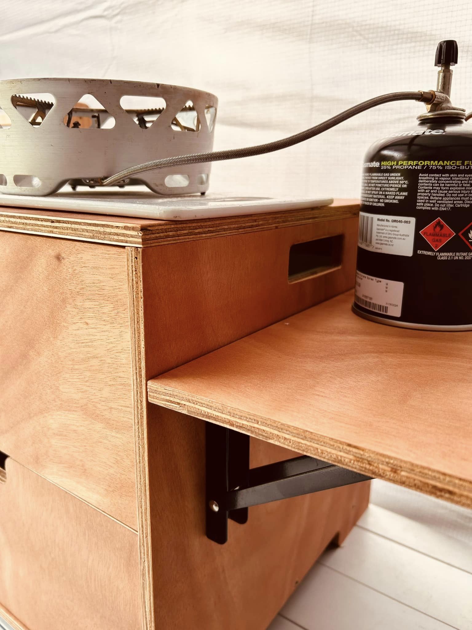 Our Single Burner Kitchen Unit is designed to hold a standard suitcase butane stove in one of the drawers, or if you need extra space, you can strap it to the top with a short tie-down strap. It’s the perfect spot for your spices, cups, plates, and even a spare butane canister.