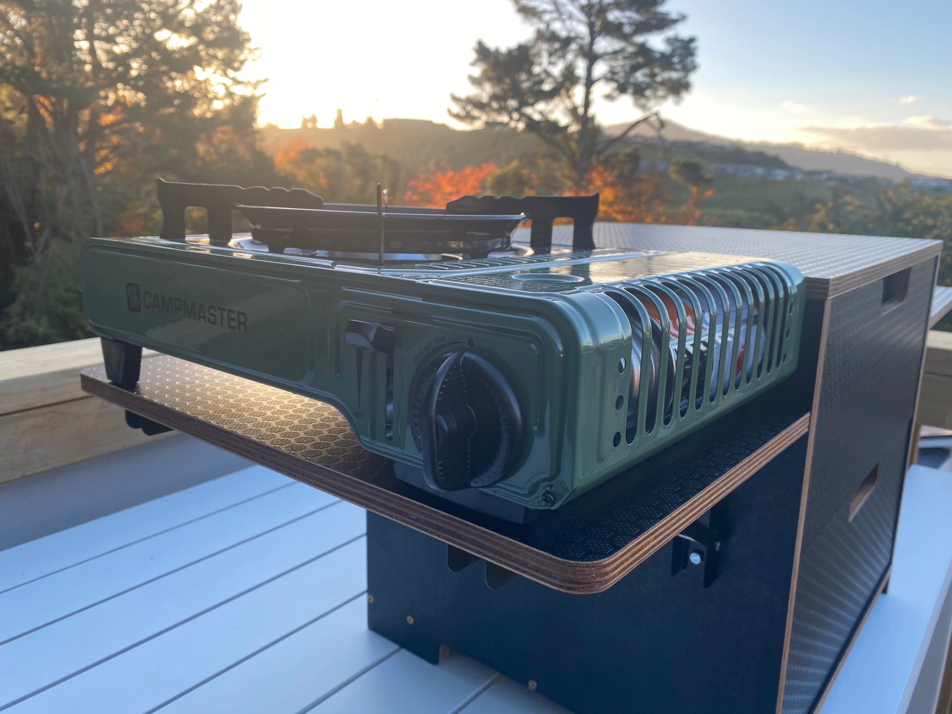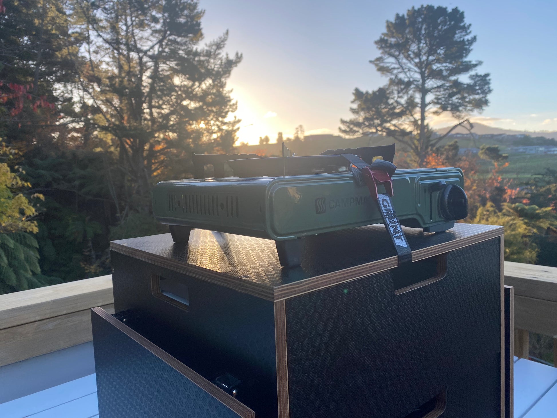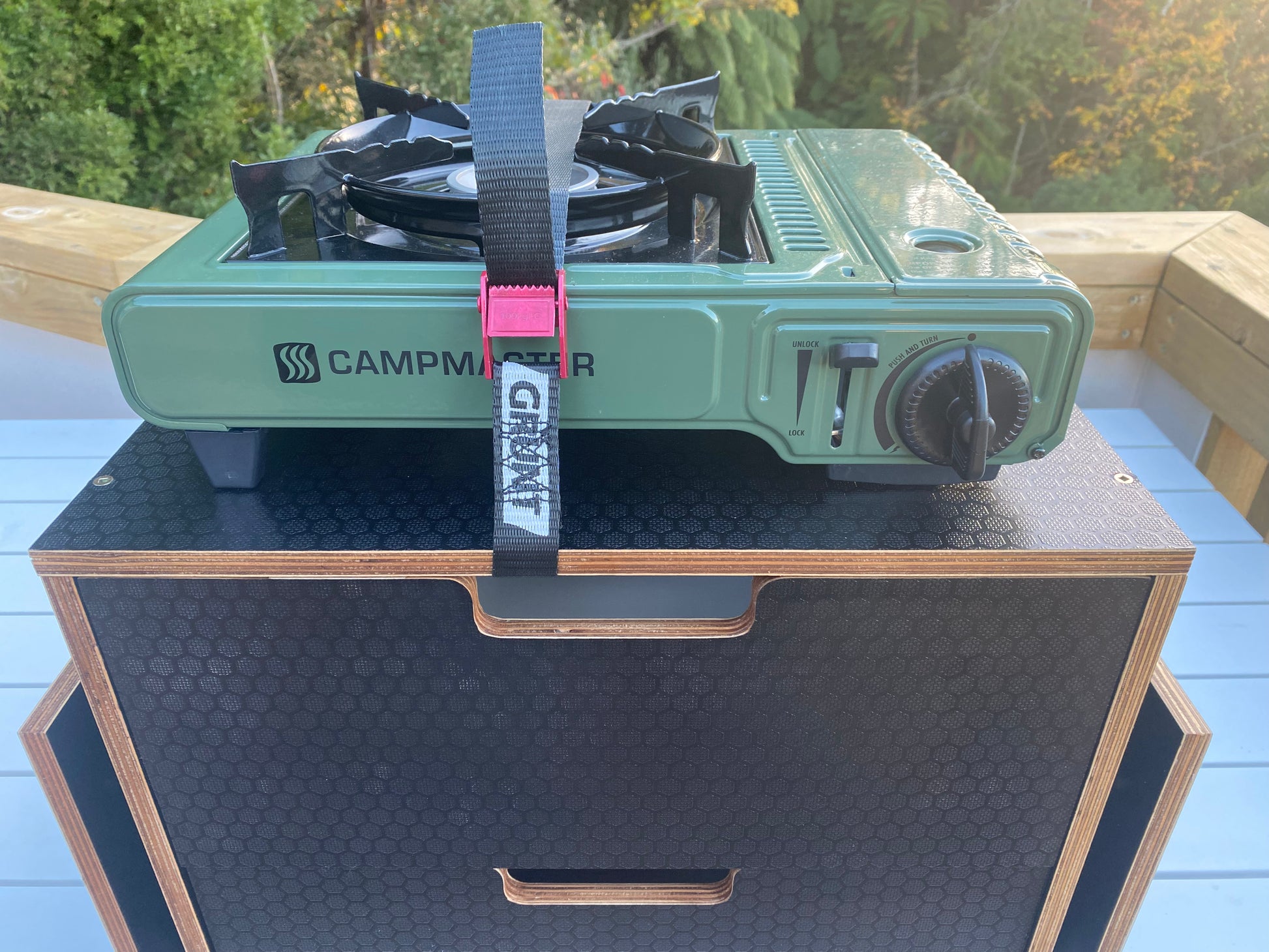 Our STEALTH Single Burner Kitchen Unit is designed to hold a standard suitcase butane stove in one of the drawers, or if you need extra space, you can strap it to the top with a short tie-down strap. It’s the perfect spot for your spices, cups, plates, and even a spare butane canister.